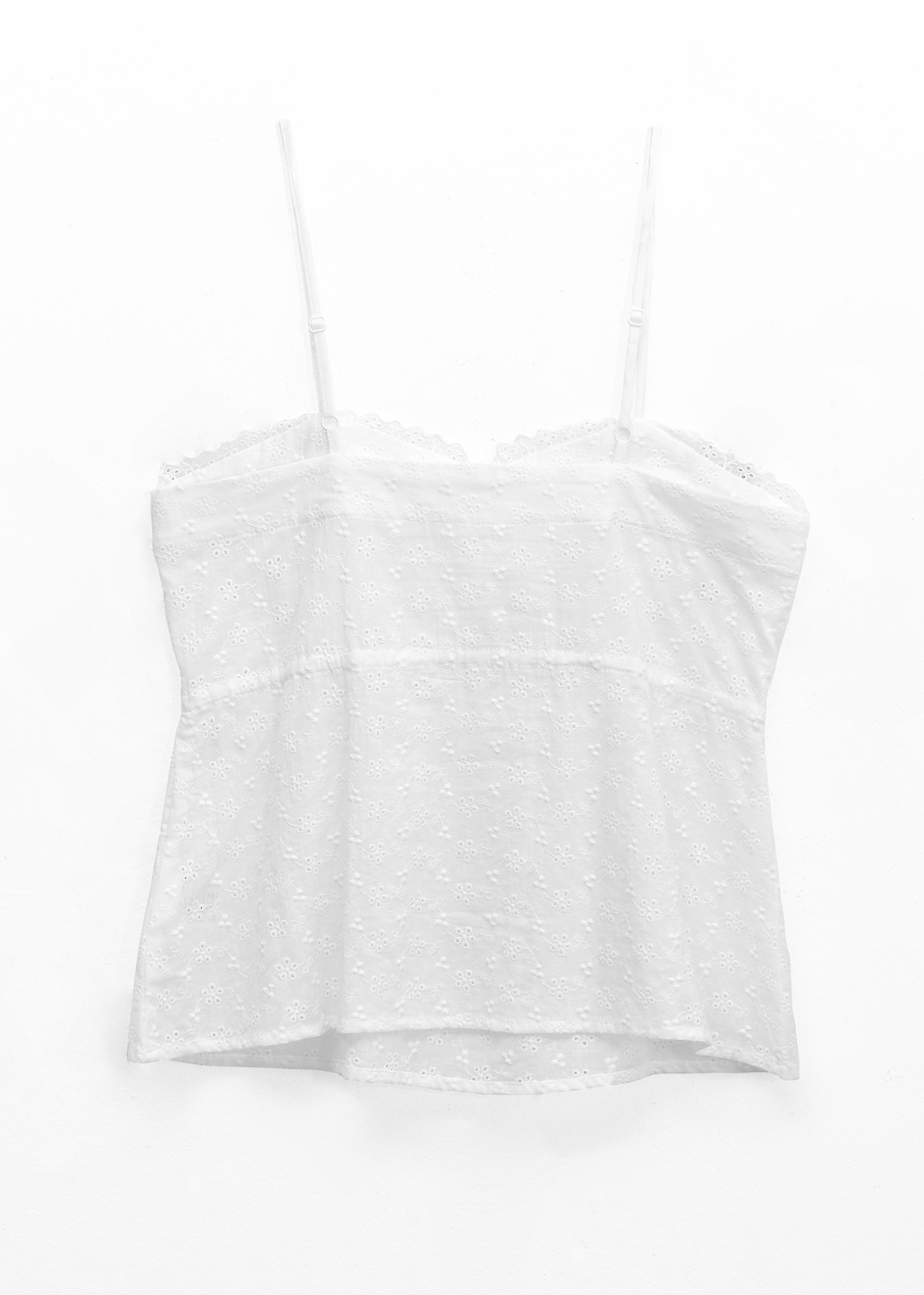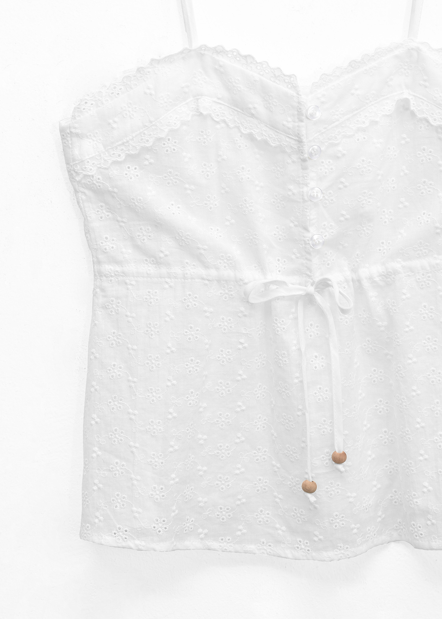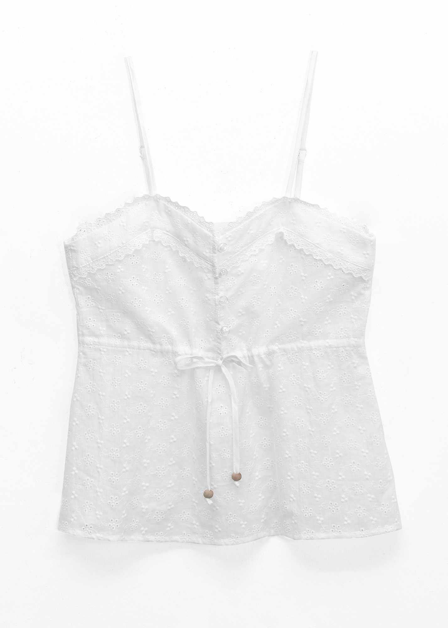 Blusa de broderie con detalle de puntilla, bordado, botones delanteros y tiras con frunce para ajustar // MODELO IMPORTADO