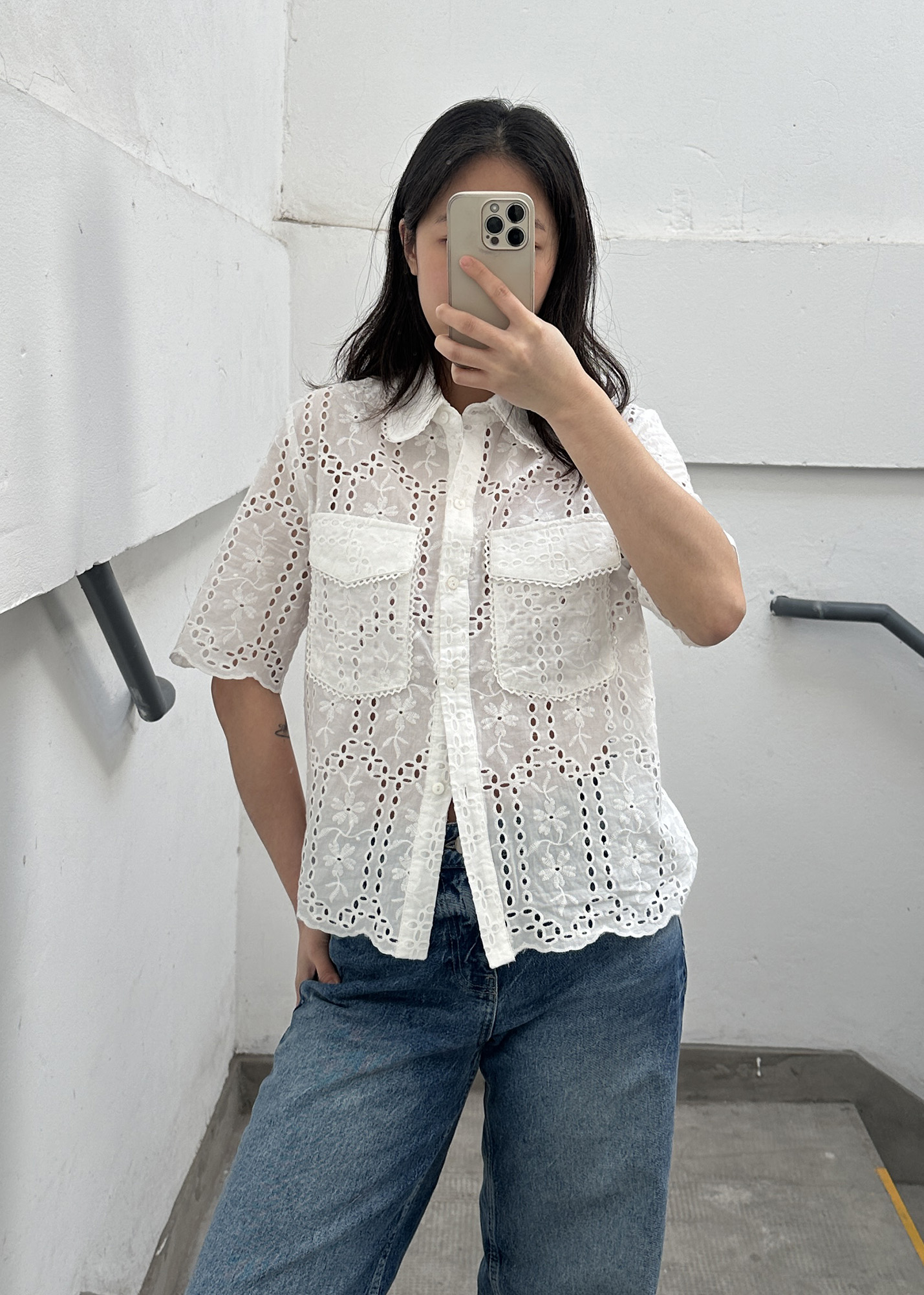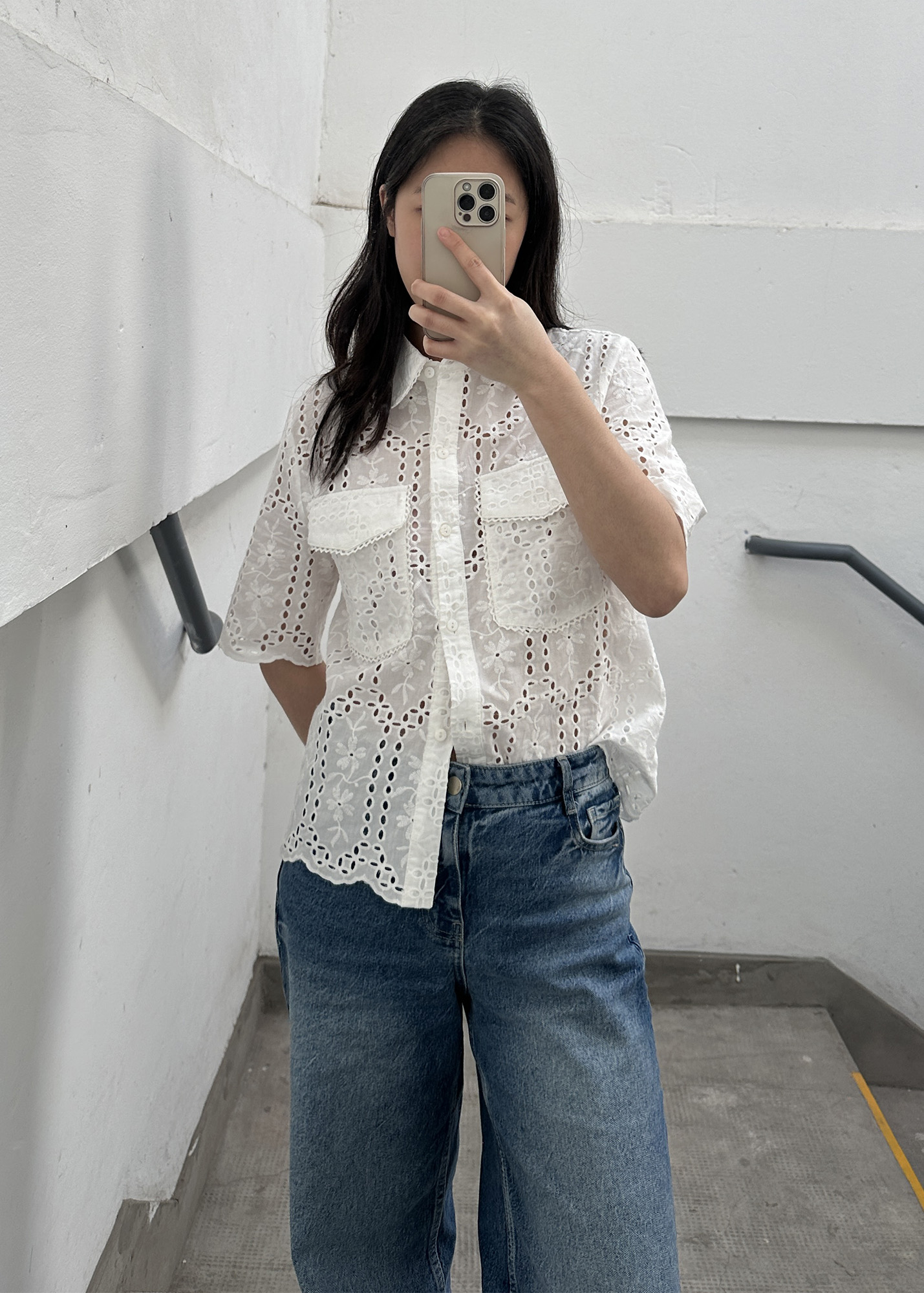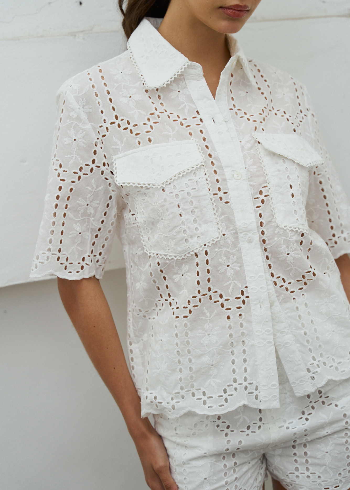 Camisa de broderie suelto, con bolsillos frontales, botones al tono y terminación festoneada en ruedo y cuello // MODELO IMPORTADO