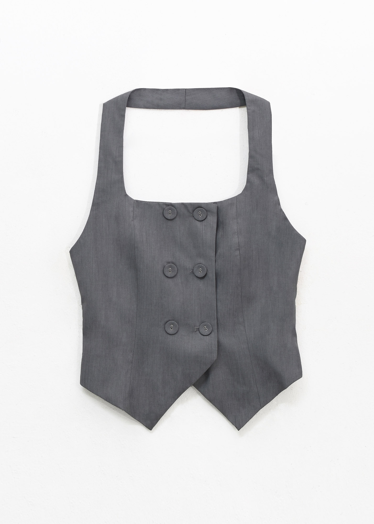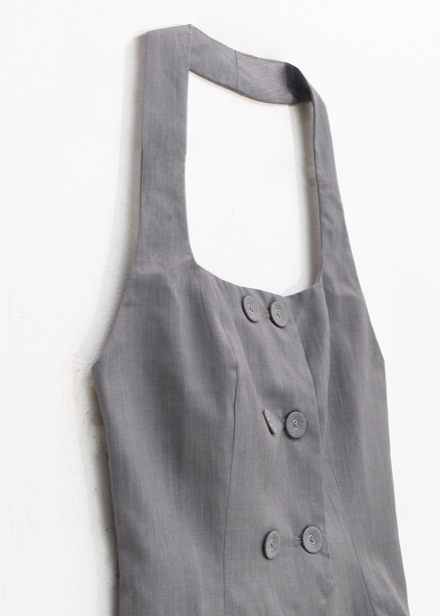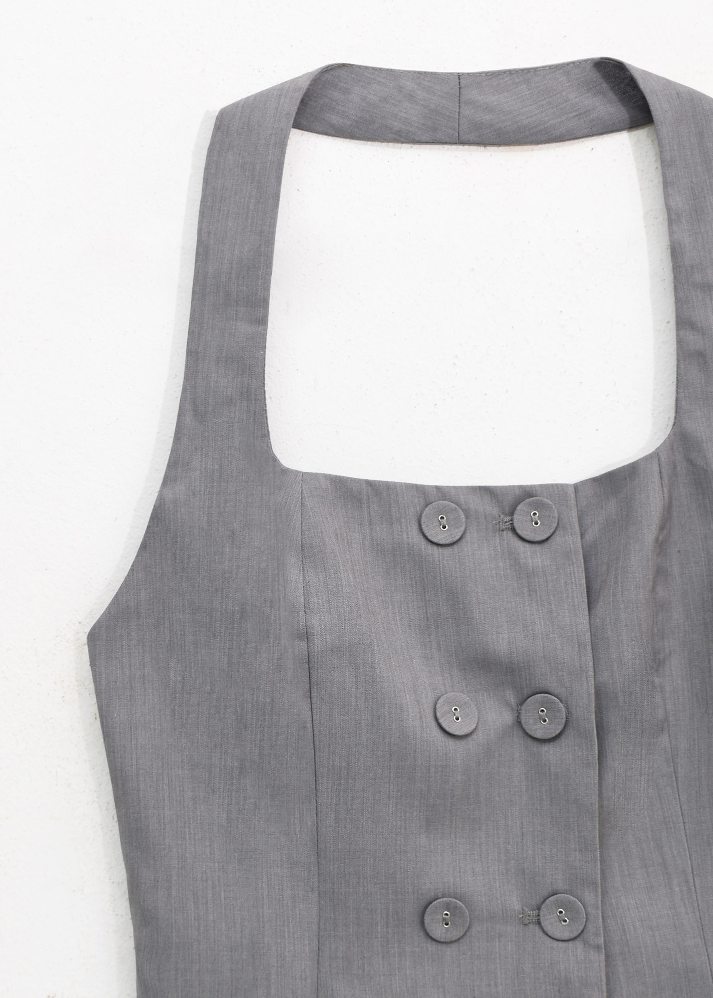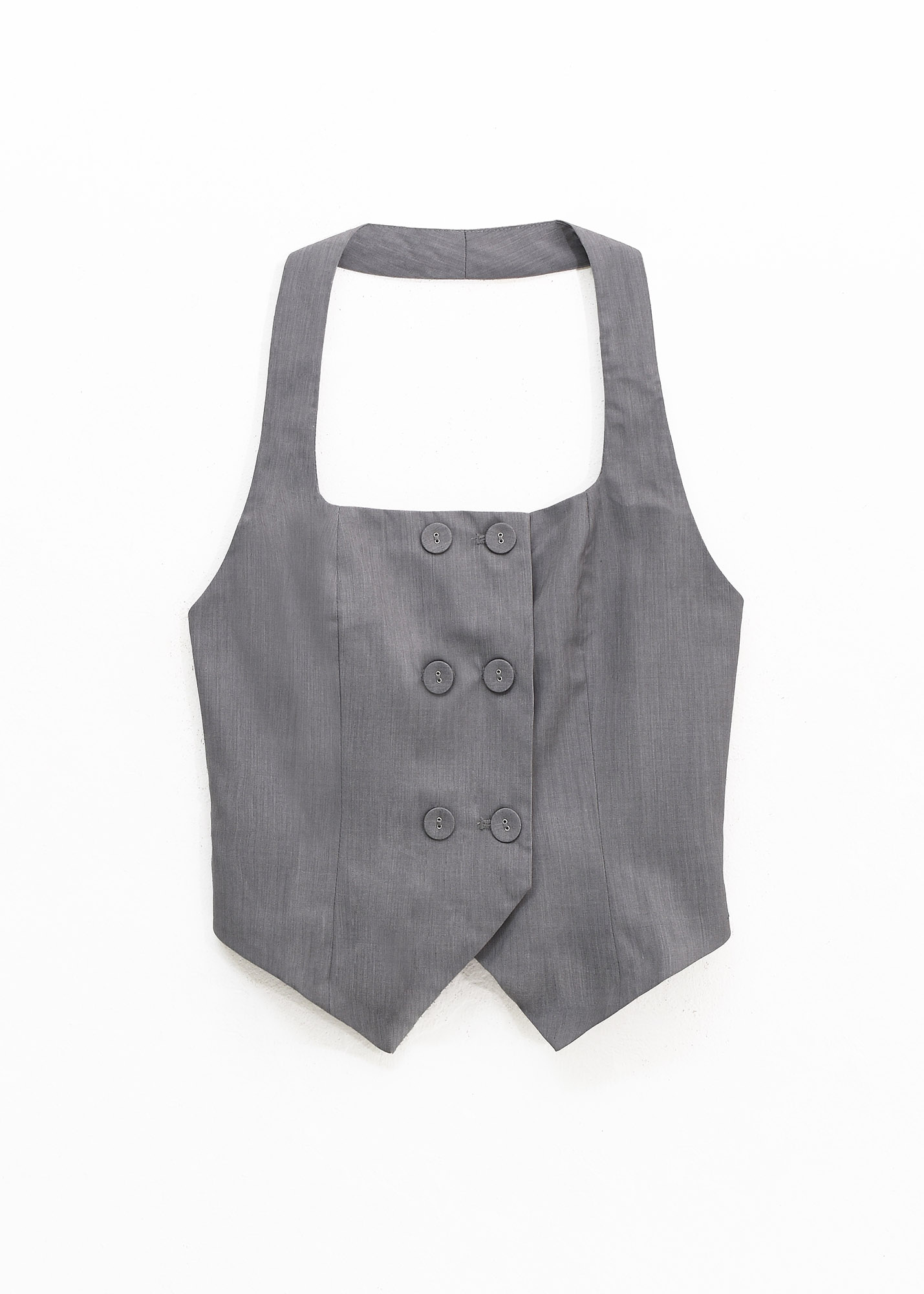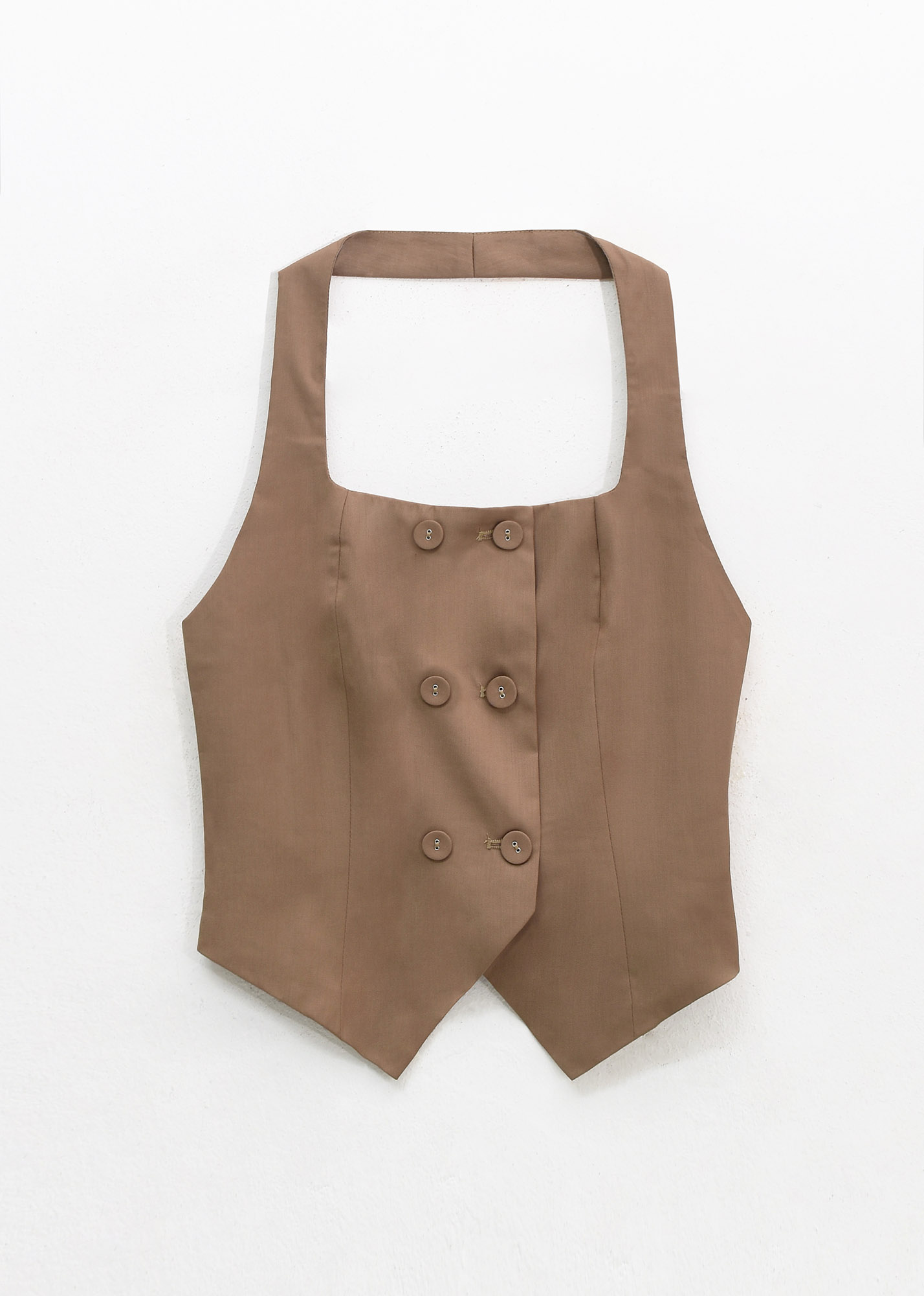 Chaleco tipo crop top halter con escote cuadrado, elástico en la espalda. Detalle de doble abotonadura con botones forrados // MODELO IMPORTADO