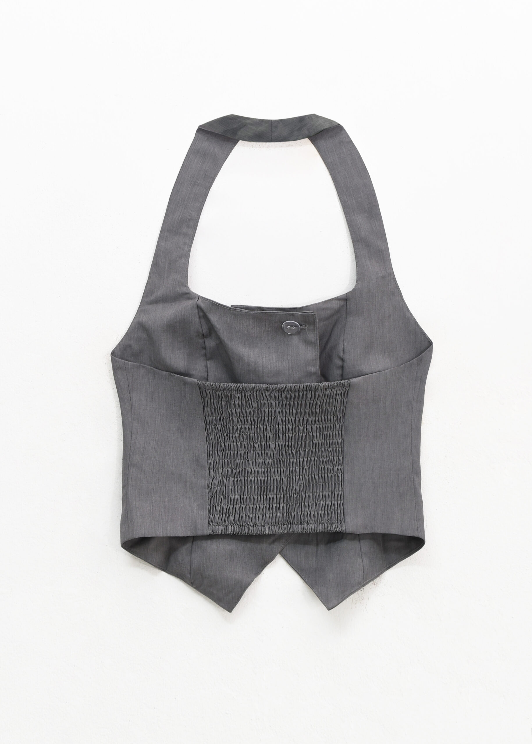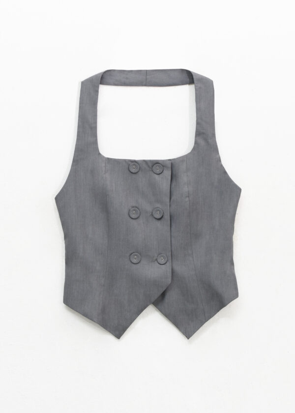 Chaleco tipo crop top halter con escote cuadrado, elástico en la espalda. Detalle de doble abotonadura con botones forrados // MODELO IMPORTADO