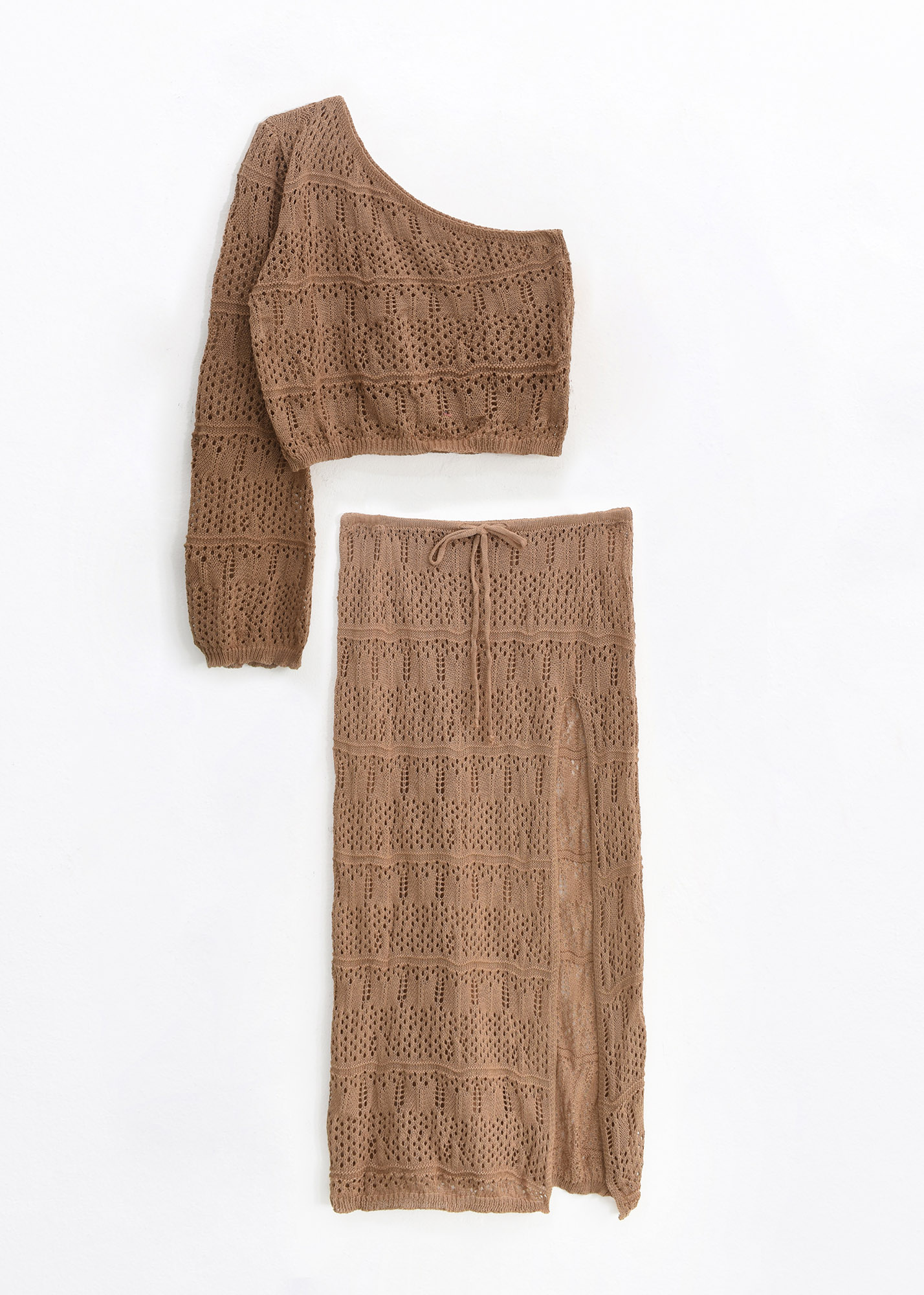 Conjunto de crochet / top asimétrico de una sola manga y pollera larga con tajo al costado y tiras para ajustar // MODELO IMPORTADO