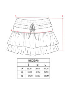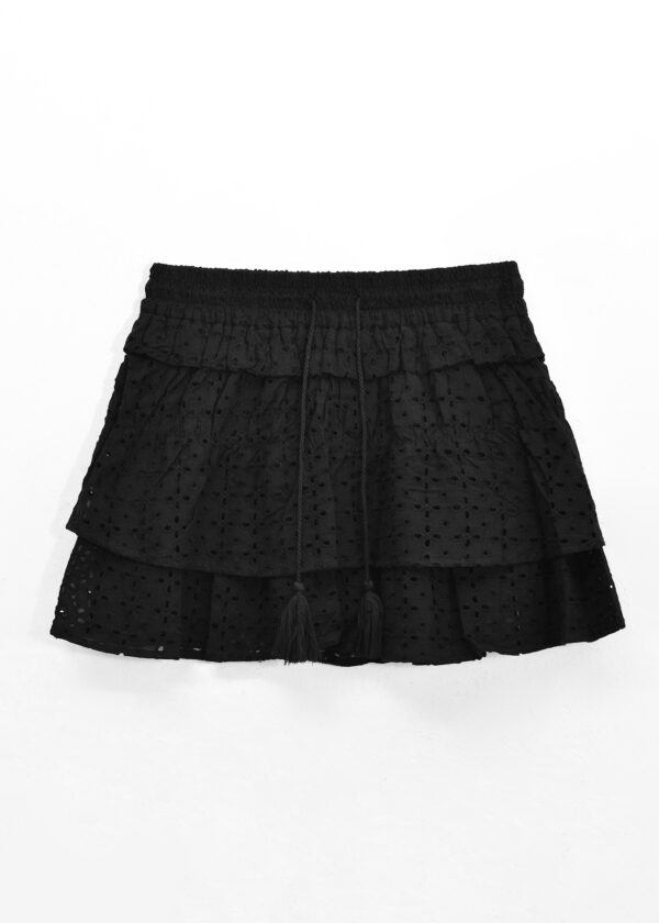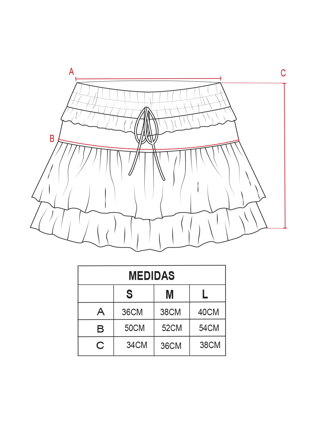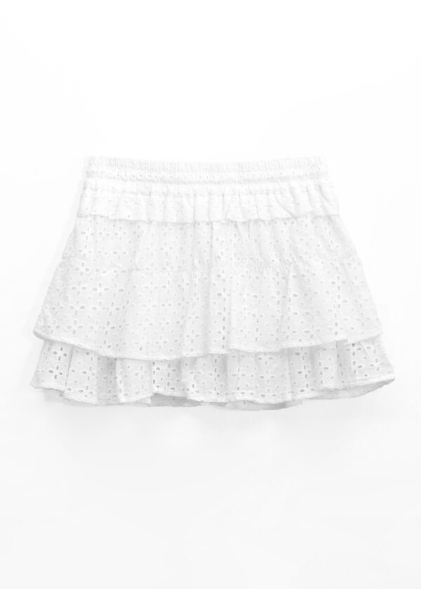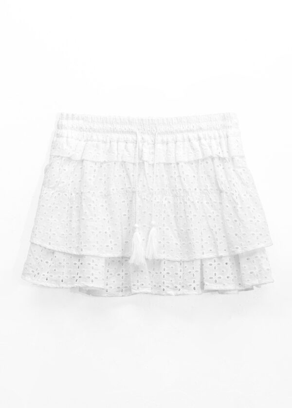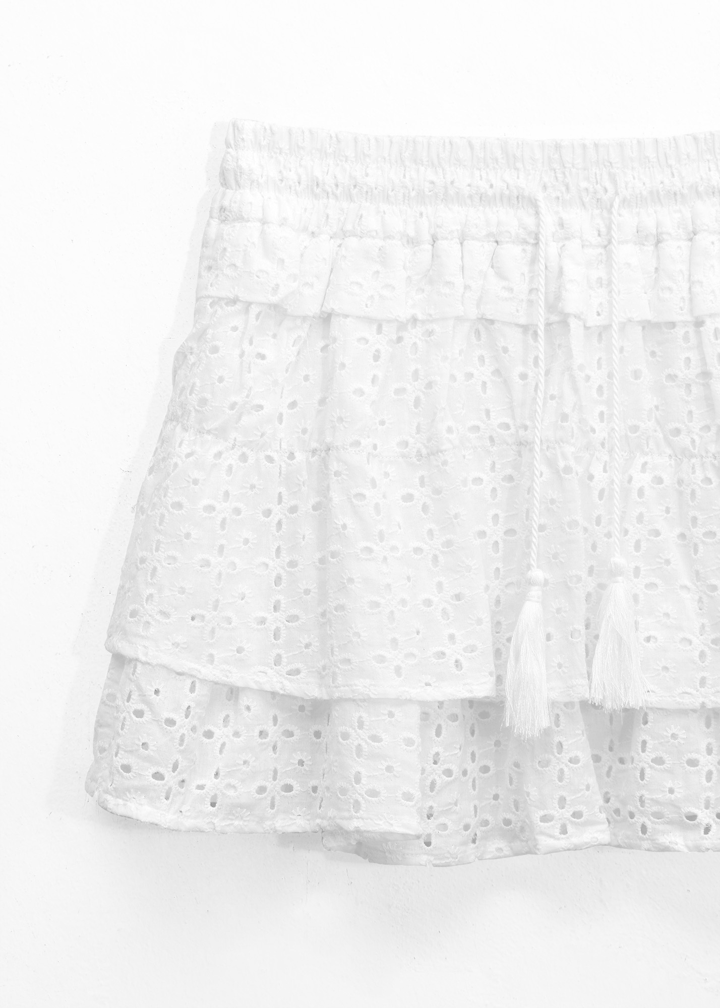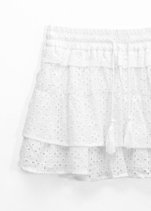 Mini de broderie con detalle de volados, puntilla. Elástico en la cintura con tiras para ajustar, incluye forrería // MODELO IMPORTADO