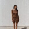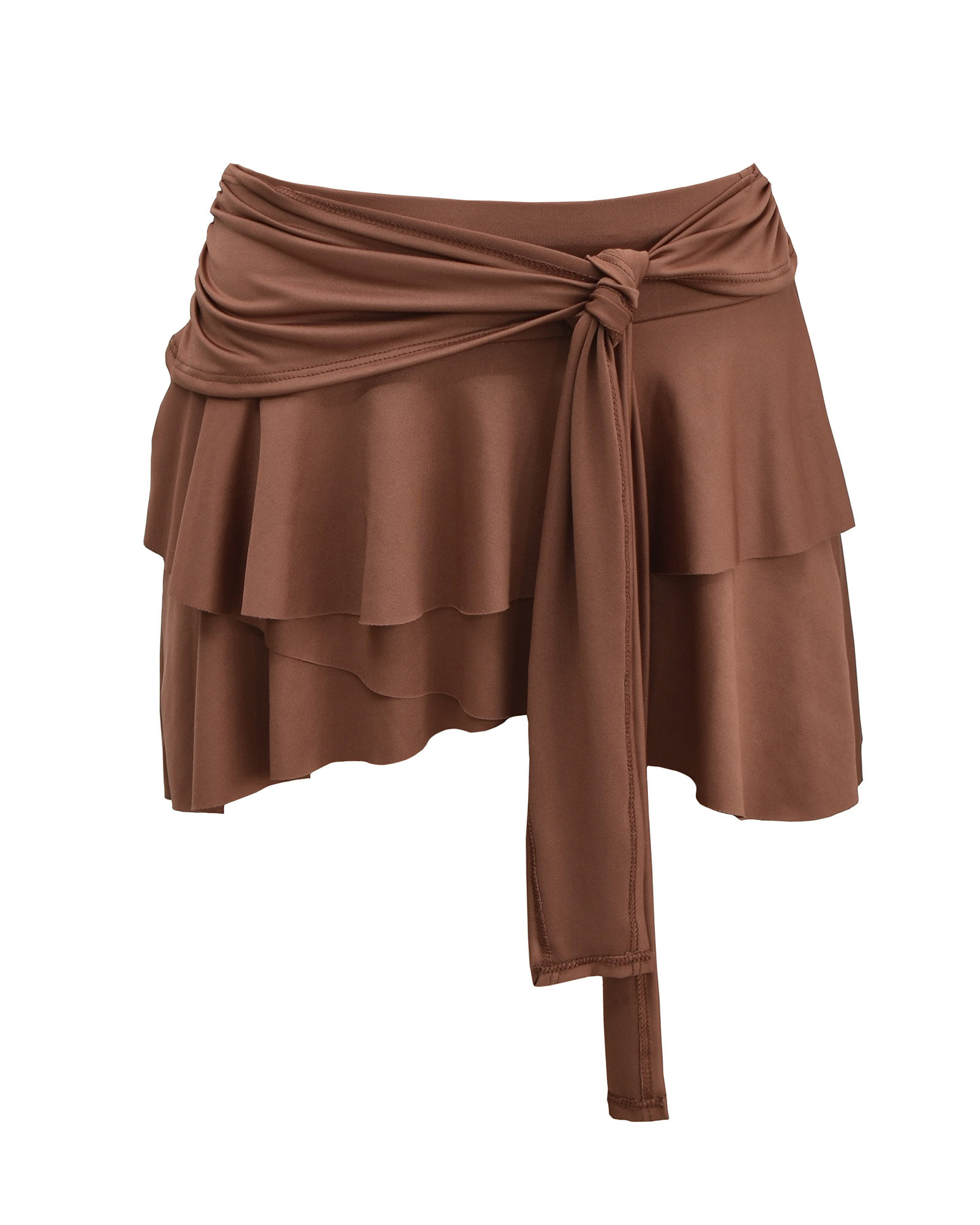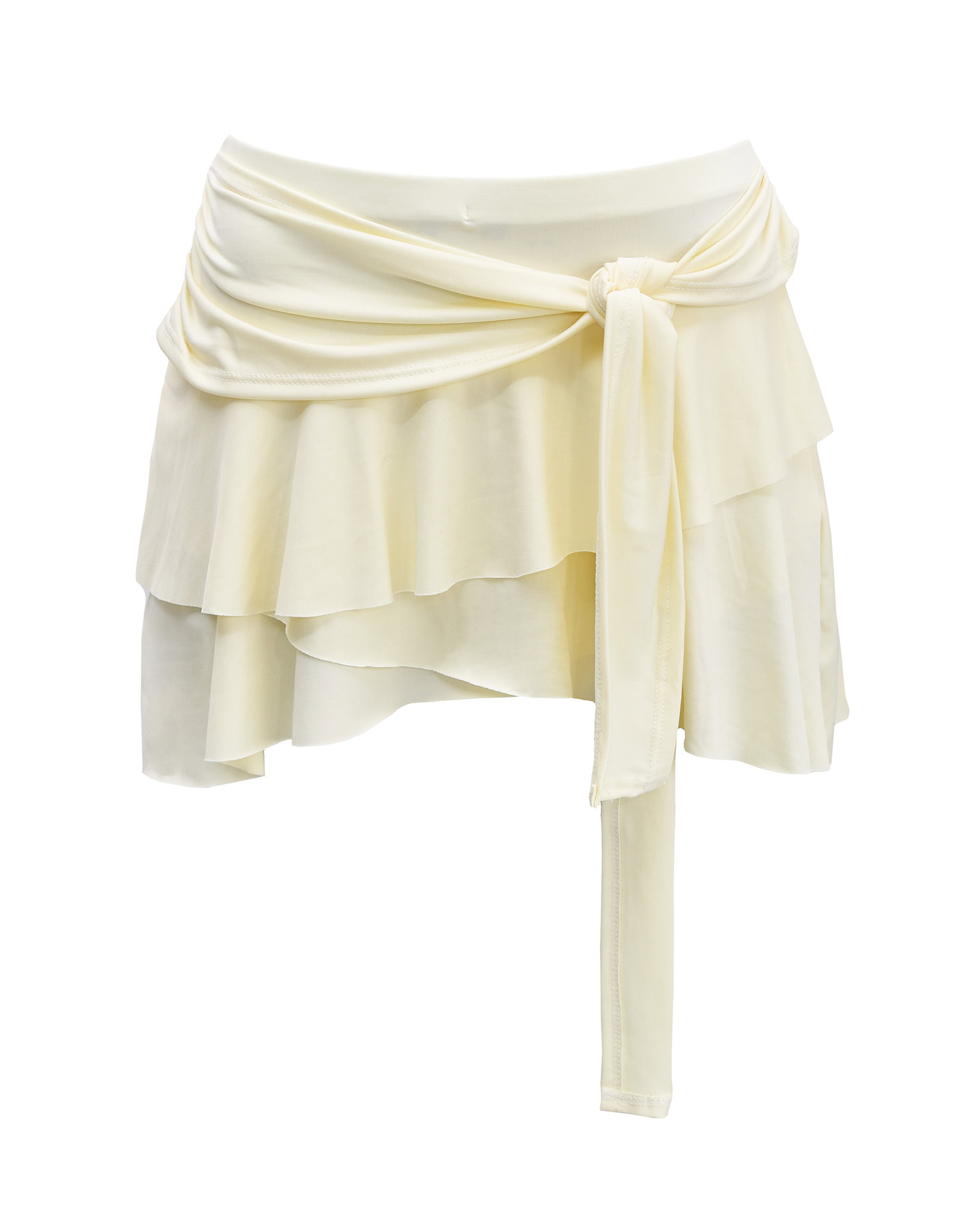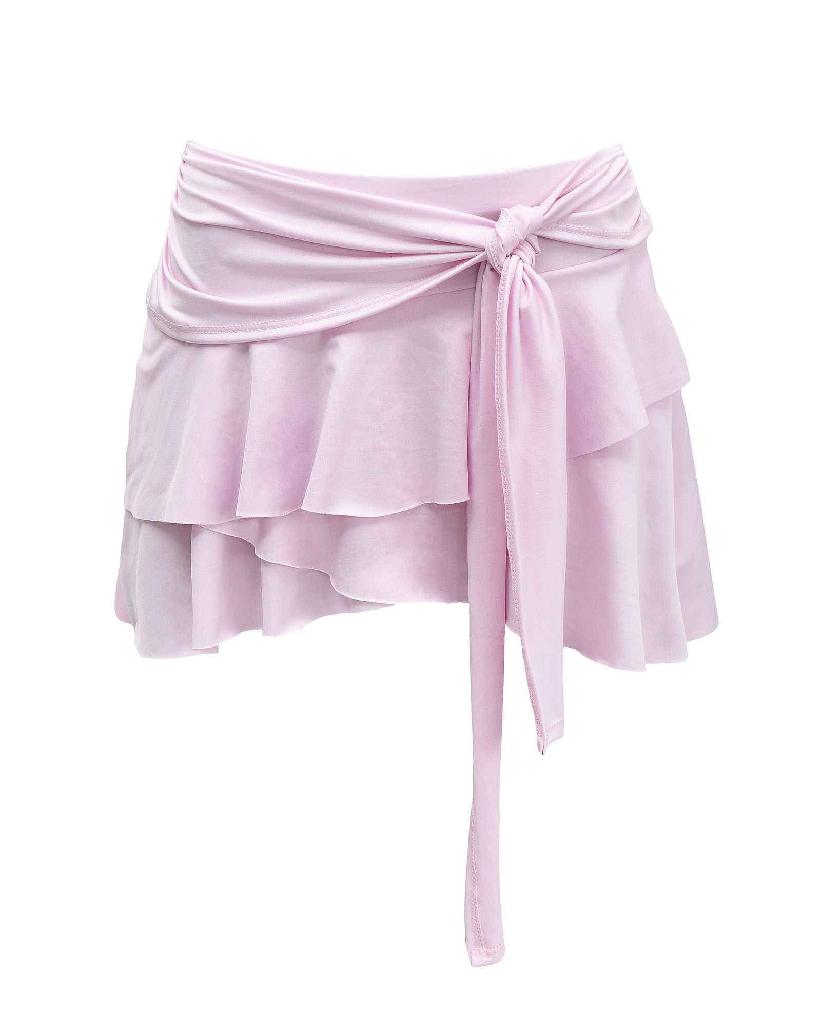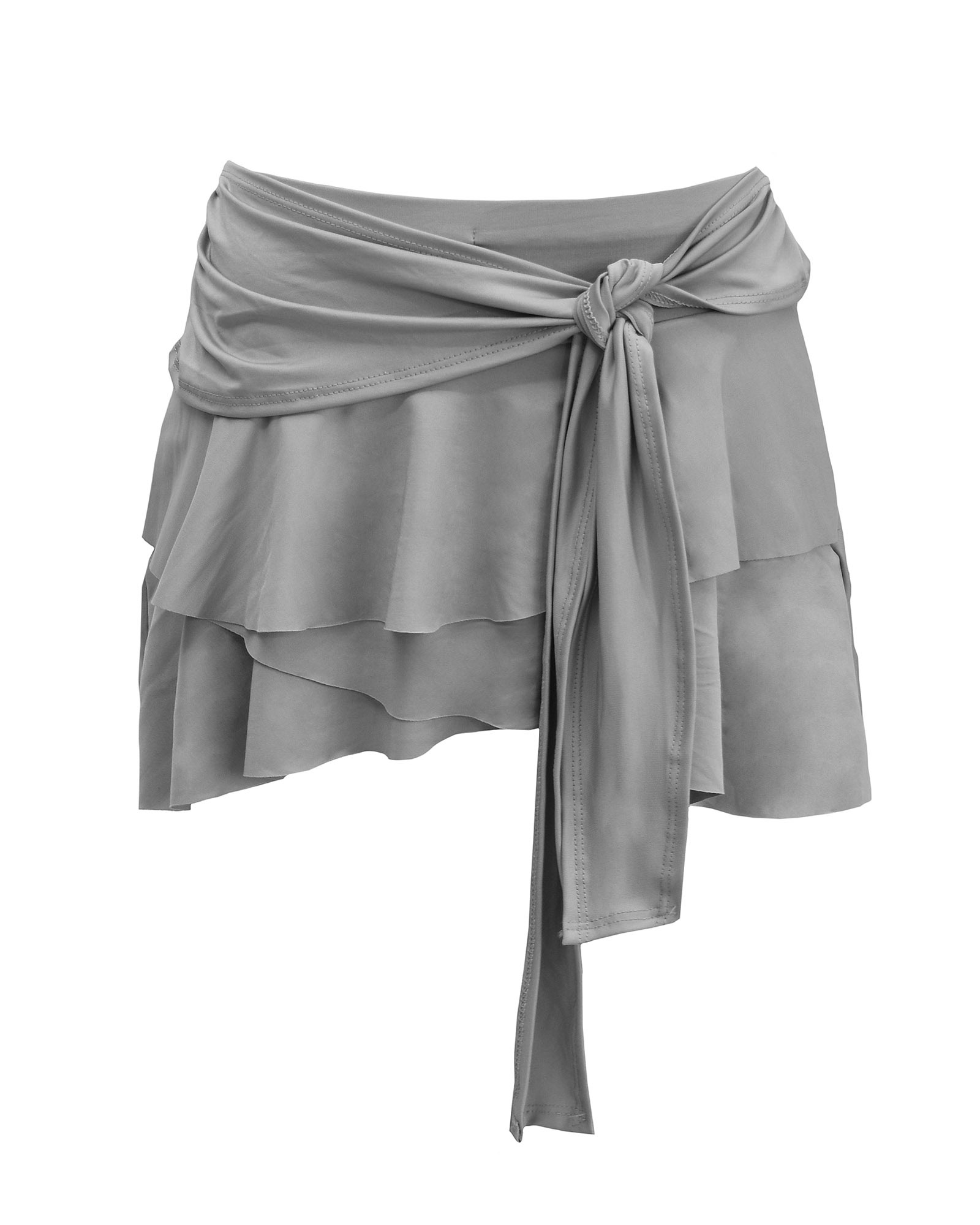 Mini tiro bajo de microfibra con detalle de capas de volado, lazo con frunce en los costados para atar