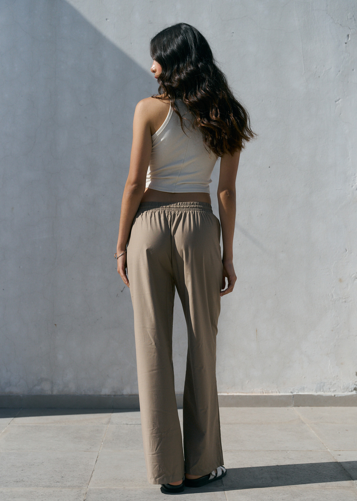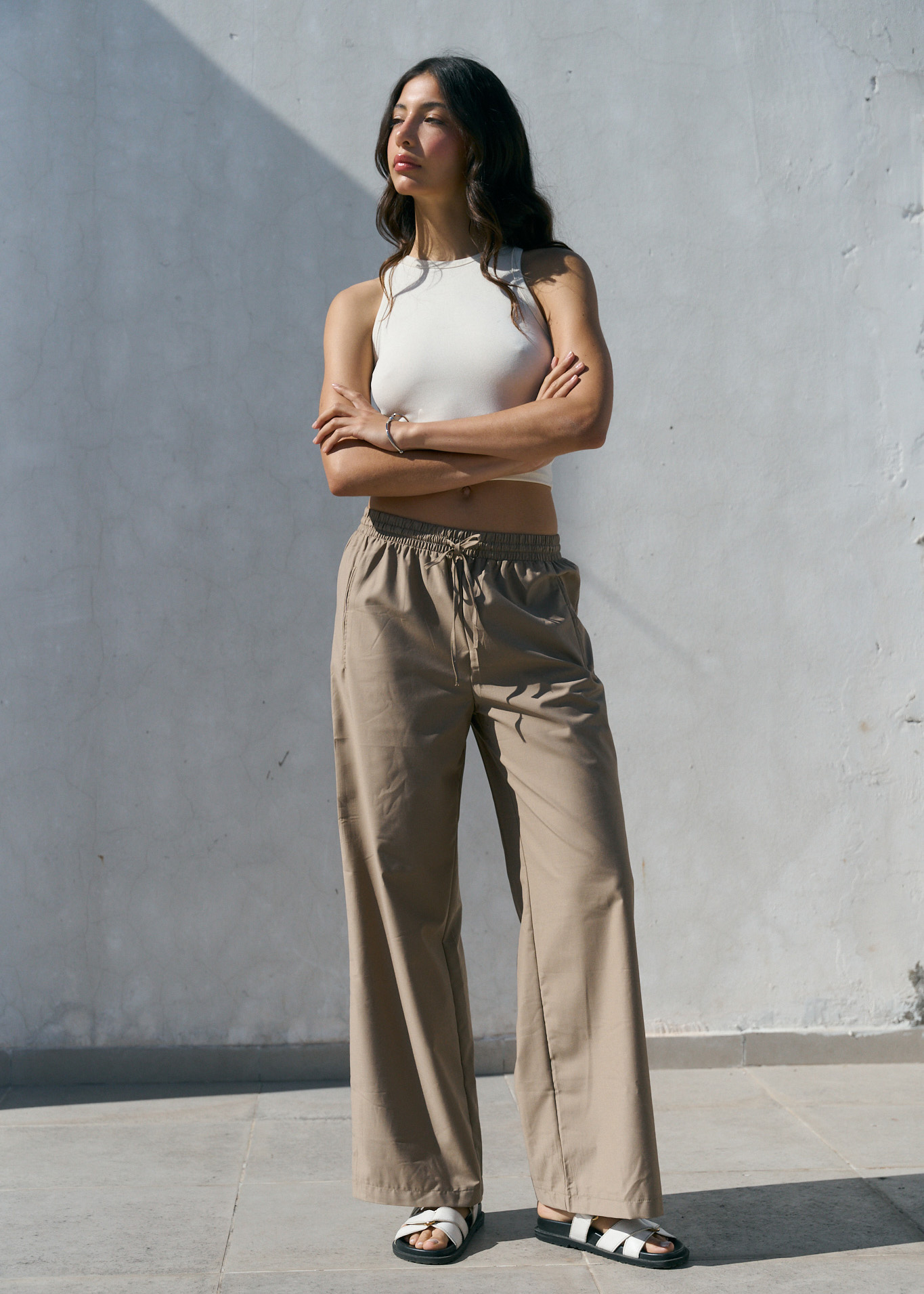 Pantalón fluido wide leg, elástico en la cintura con tiras para ajustar, detalle de bolsillo decorativo laterales // MODELO IMPORTADO