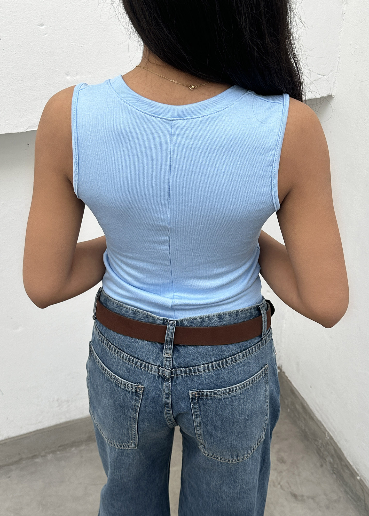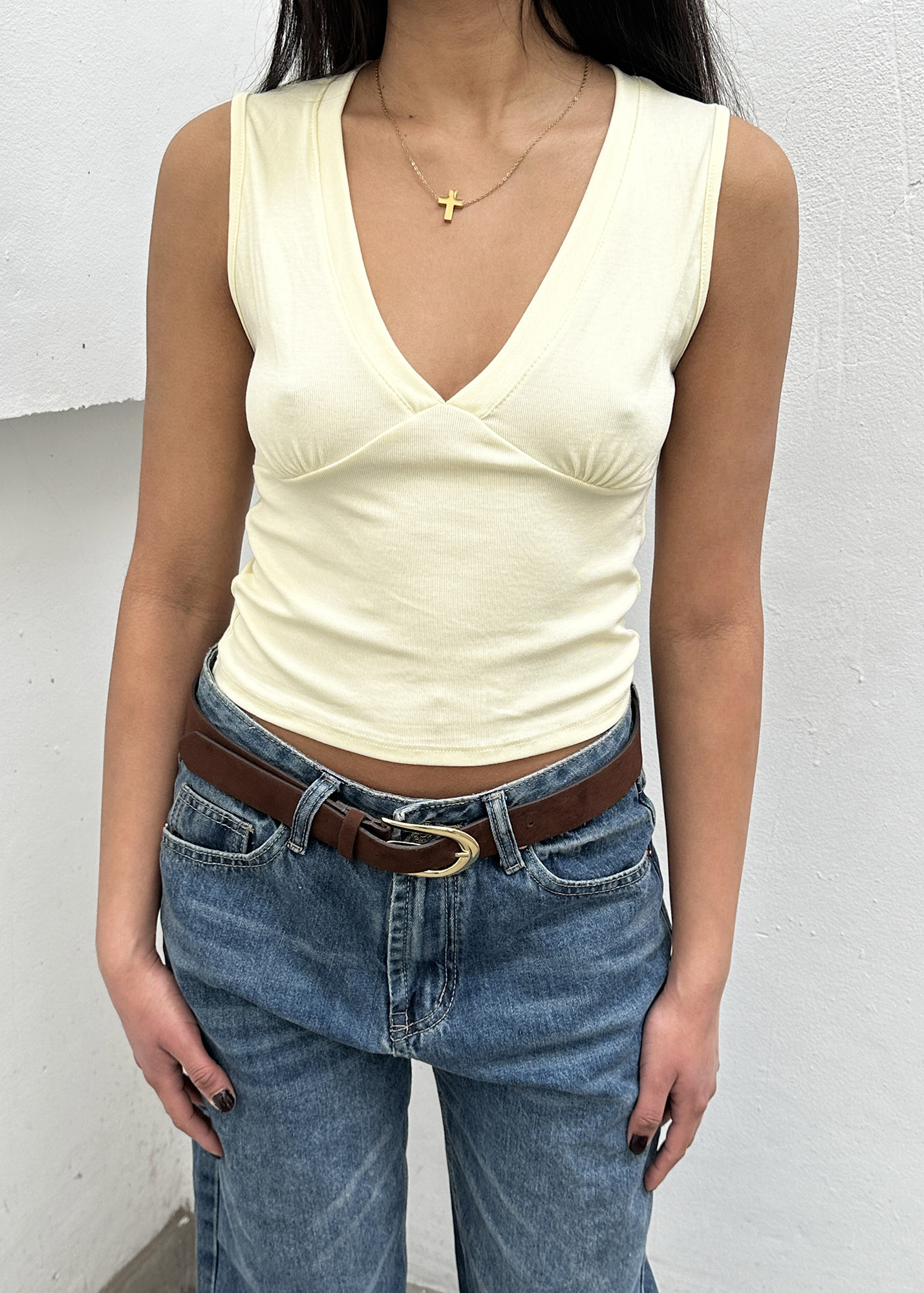 Remera musculosa corto de baby ribb rayón viscosa, escote en V con detalle de frunce en la parte delantera