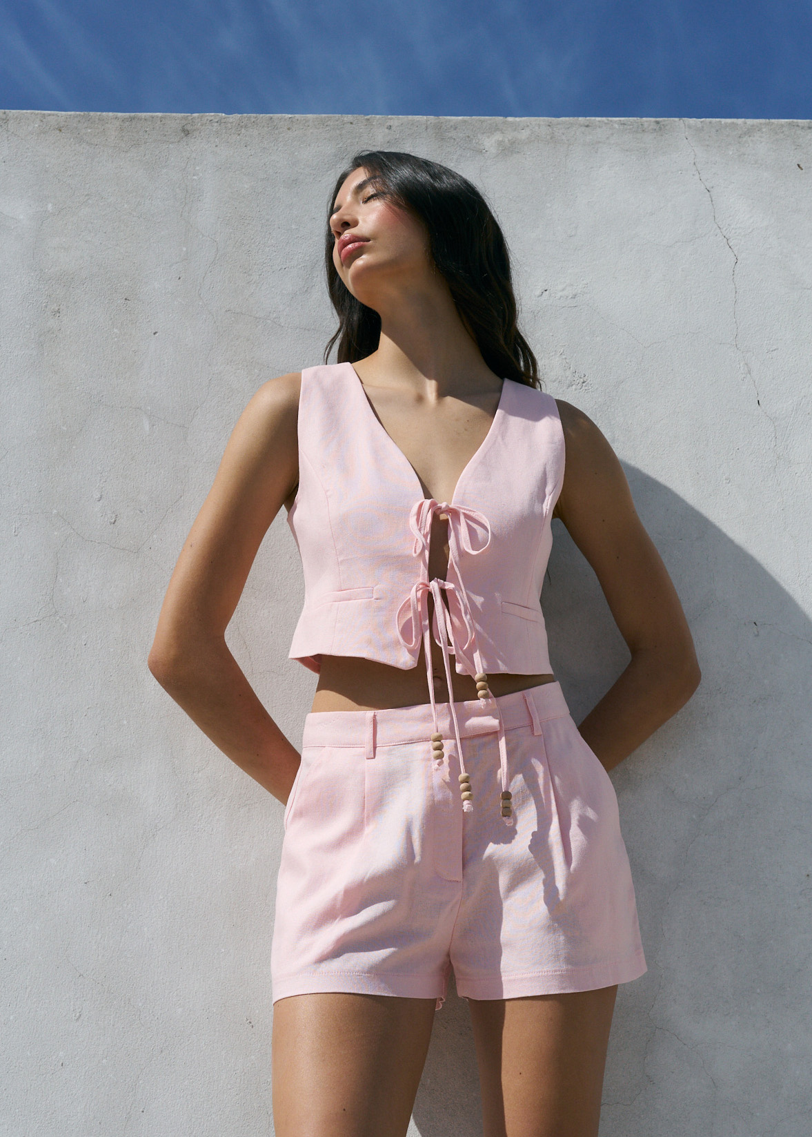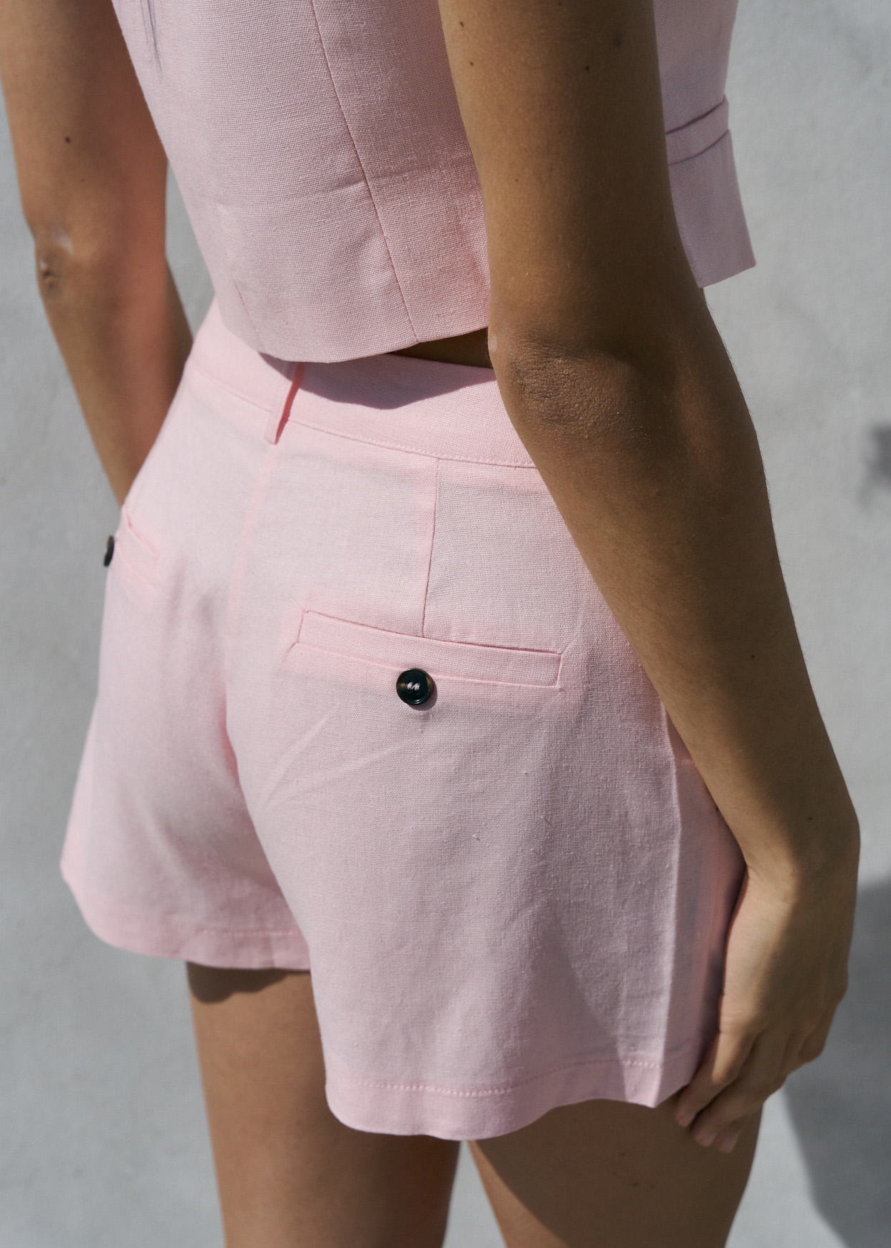 Short de lino tiro medio, con pinza delantero y trasero, bolsillos reales laterales y bolsillo falsos trasero con botones marrones // MODELO IMPORTADO
