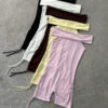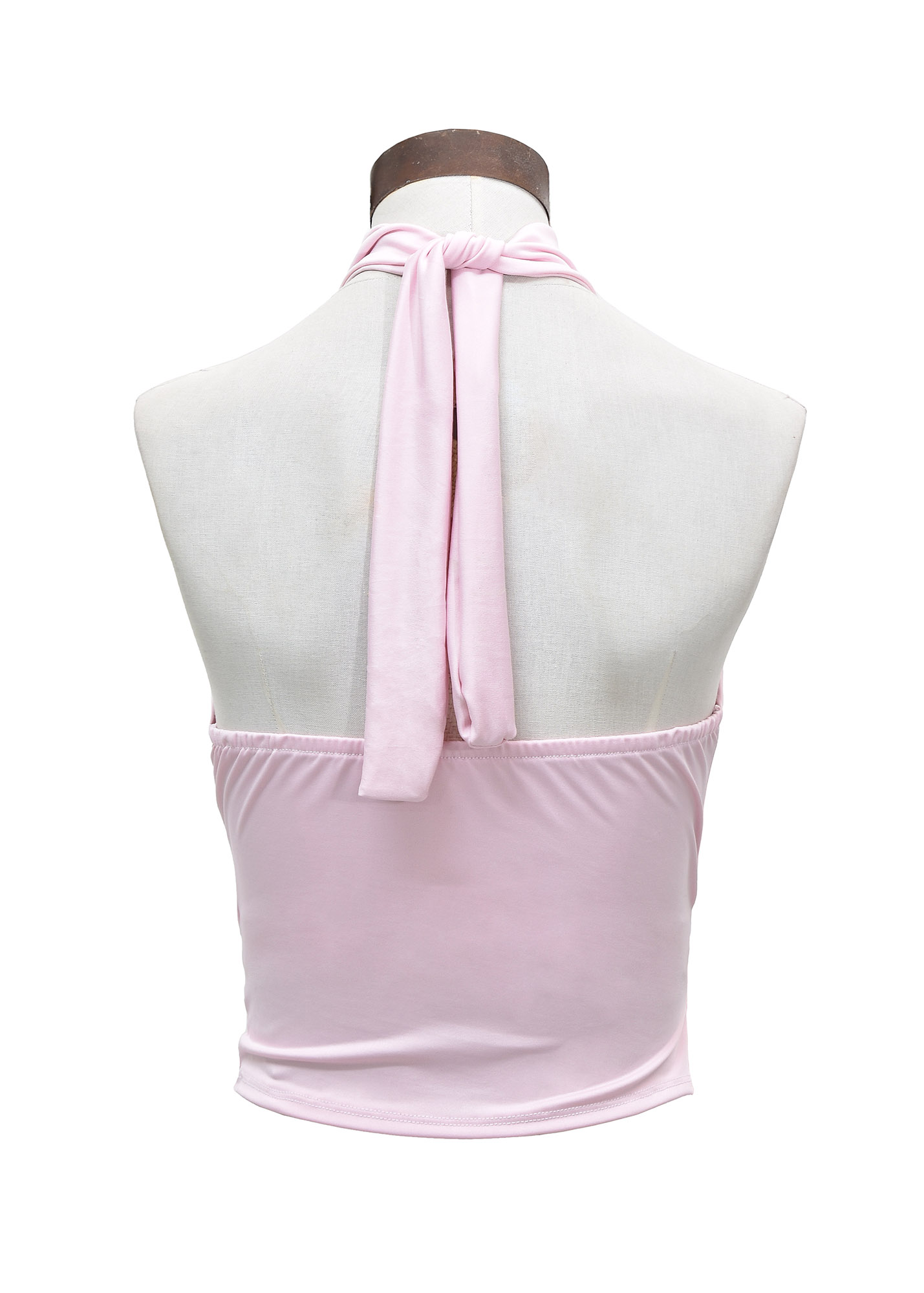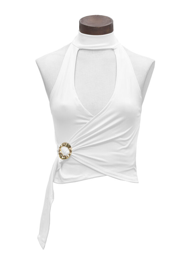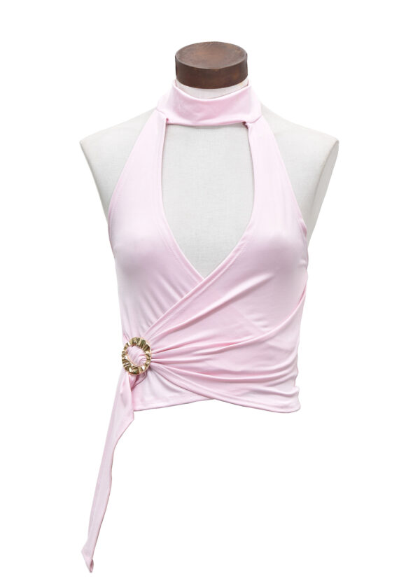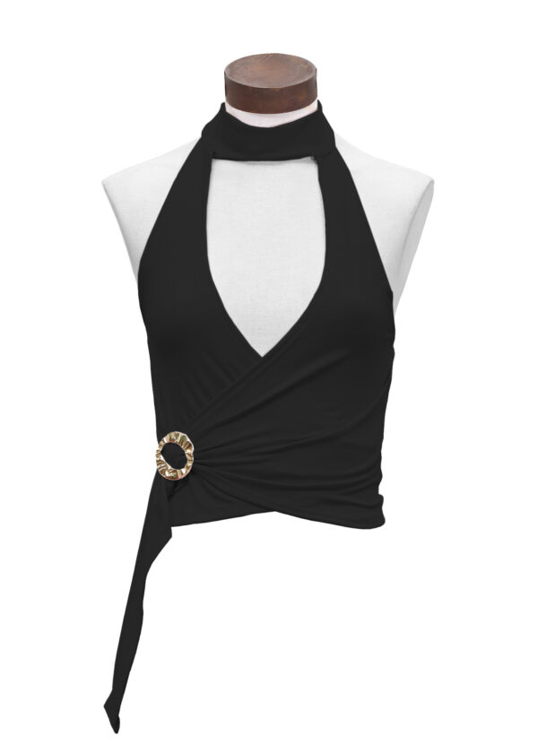 Top halter de microfibra con escote en V, diseño cruzado al frente, detalle de hebilla lateral con frunce y lazo colgante