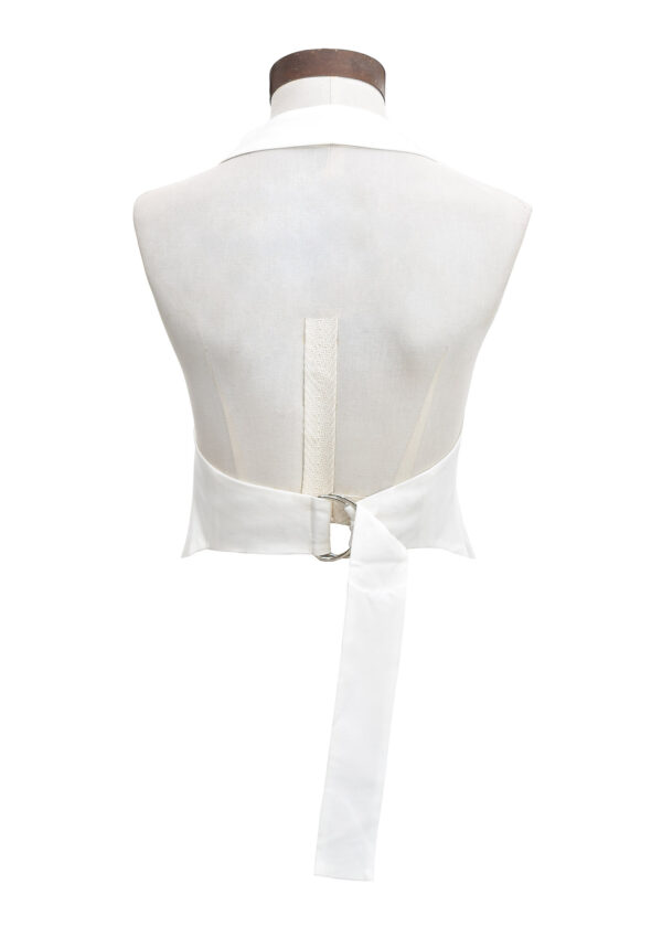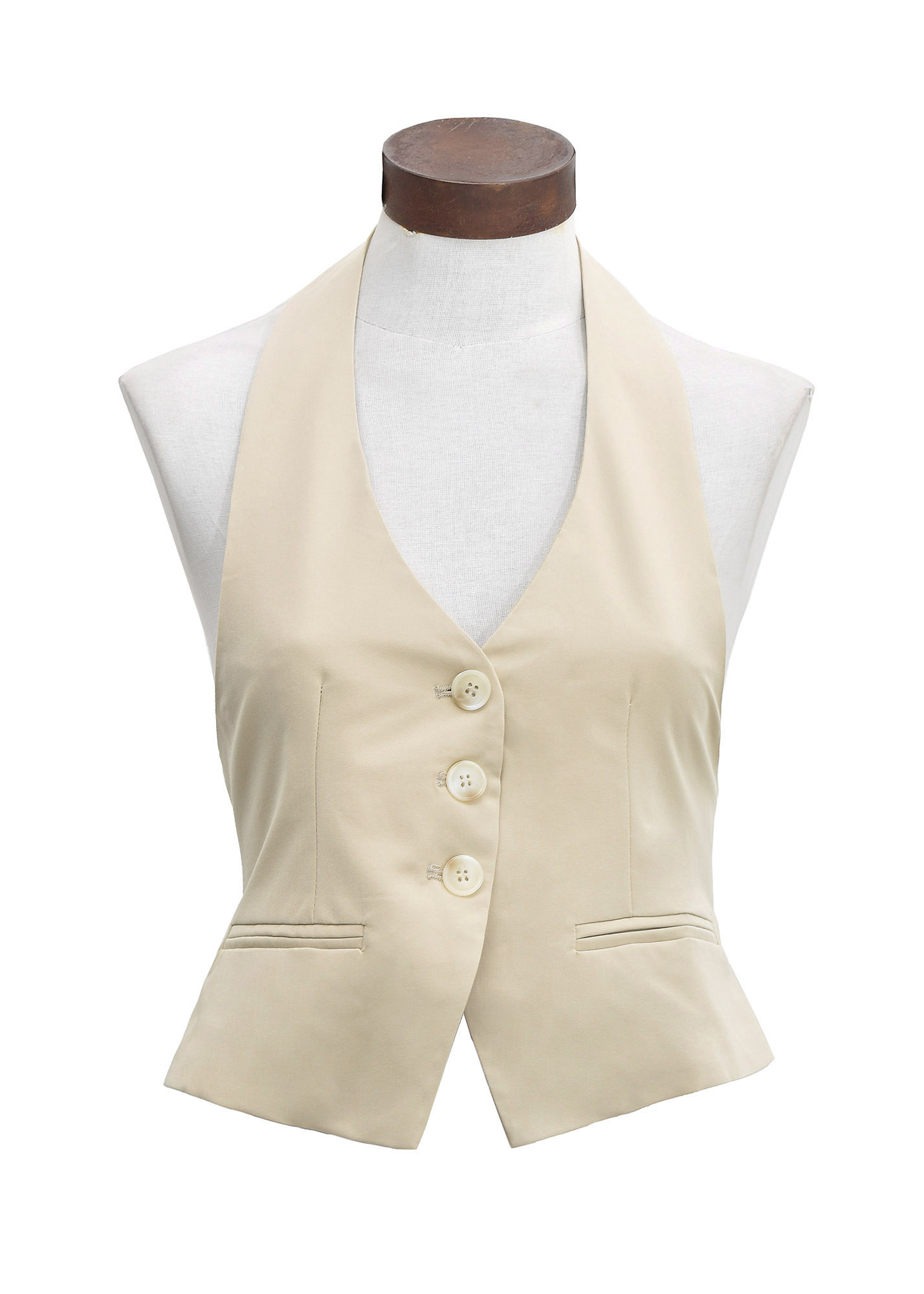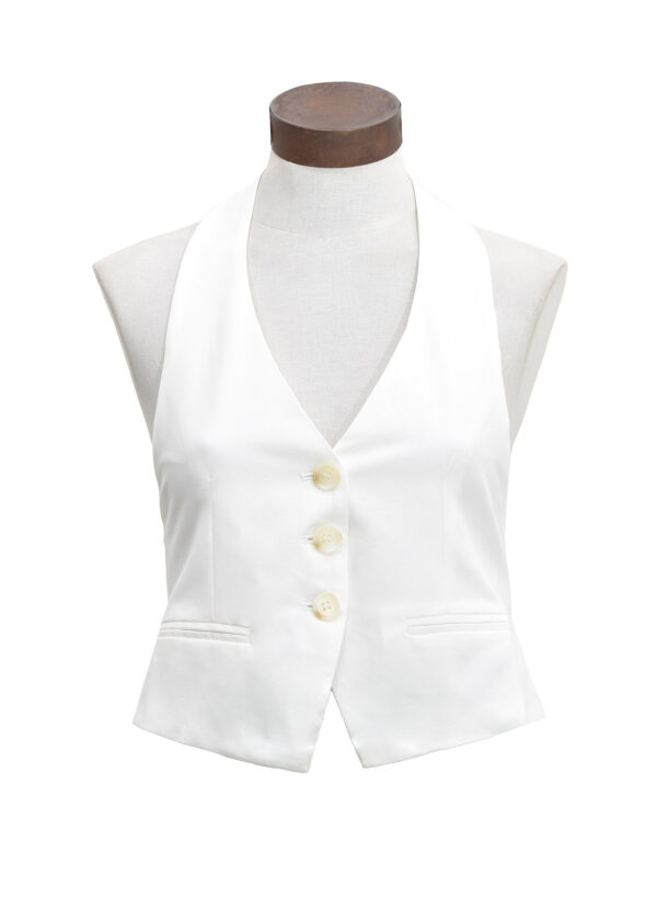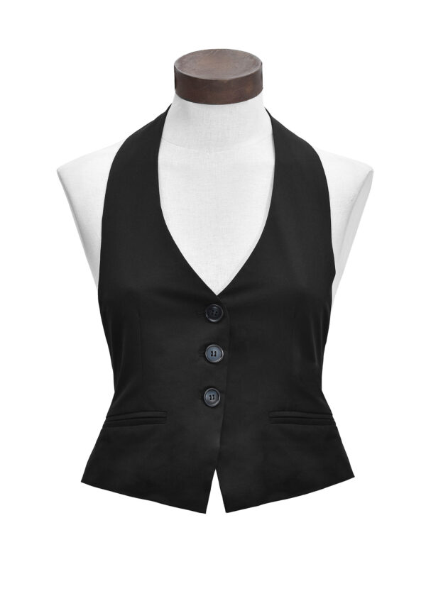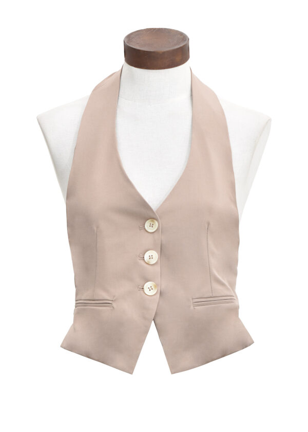 Chaleco sastrero halter con escote en V, abotonadura central con 3 botones al tono y bolsillos ojal simulados. Espalda descubierta, se ajusta con una tira que se cierra con hebilla metálica, viene forrado // MODELO IMPORTADO