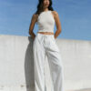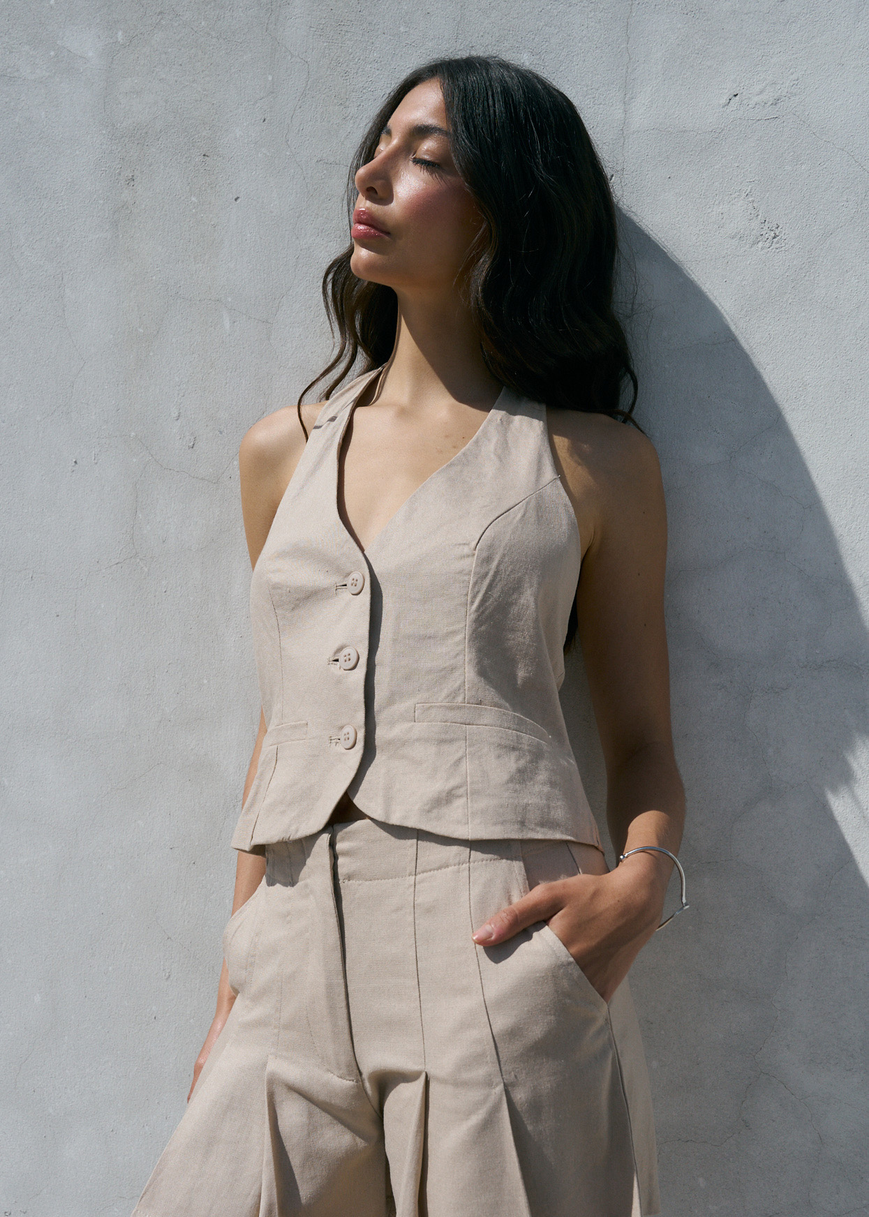 Chaleco top halter de lino, escote en V, con botones y bolsillos decorativos // MODELO IMPORTADO