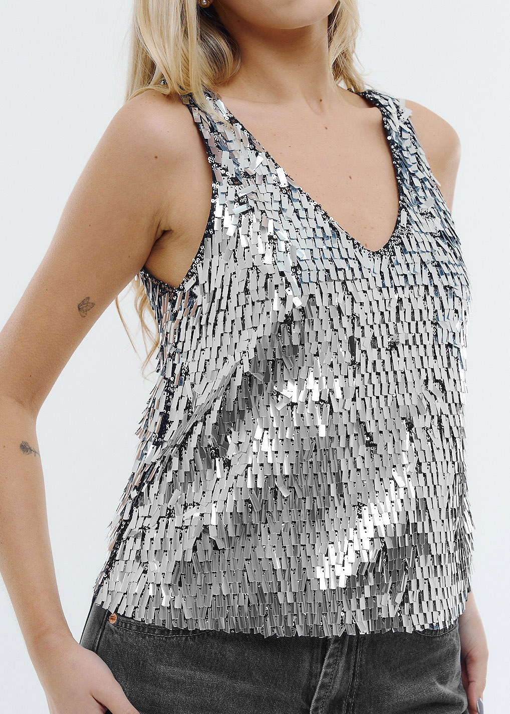 Top lentejuela paillettes rectangulares, escote en V delantero y trasero