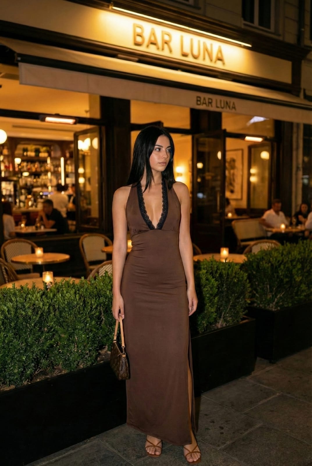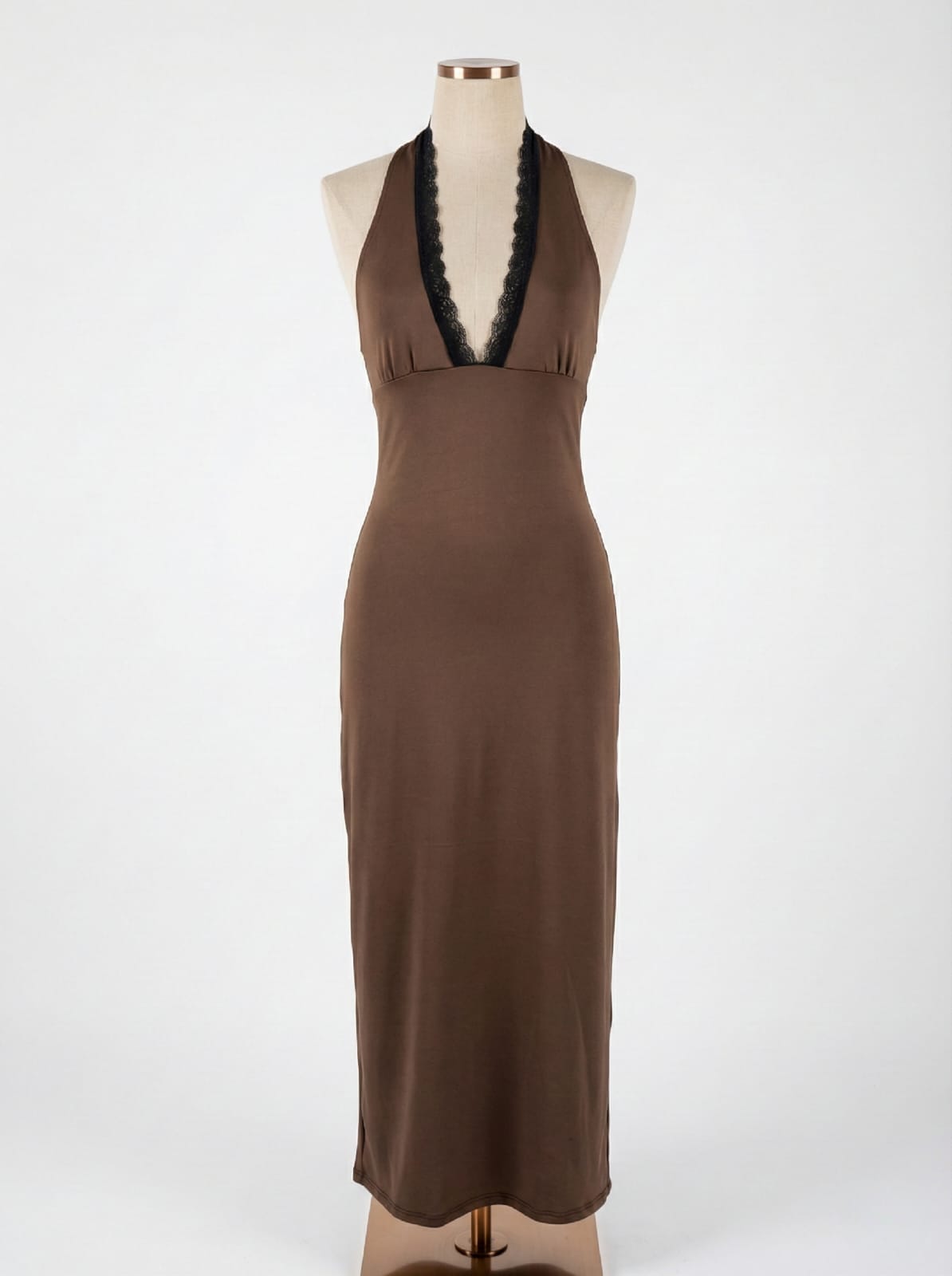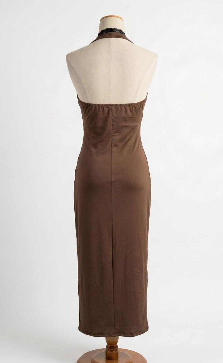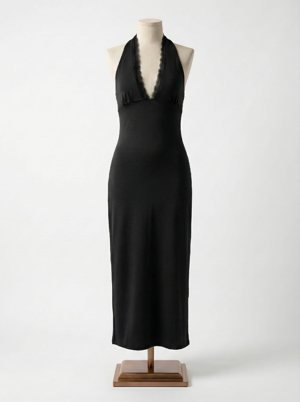VESTIDO LARGO CON PUNTILLA Y TAJO DE TELA MICROFIBRA