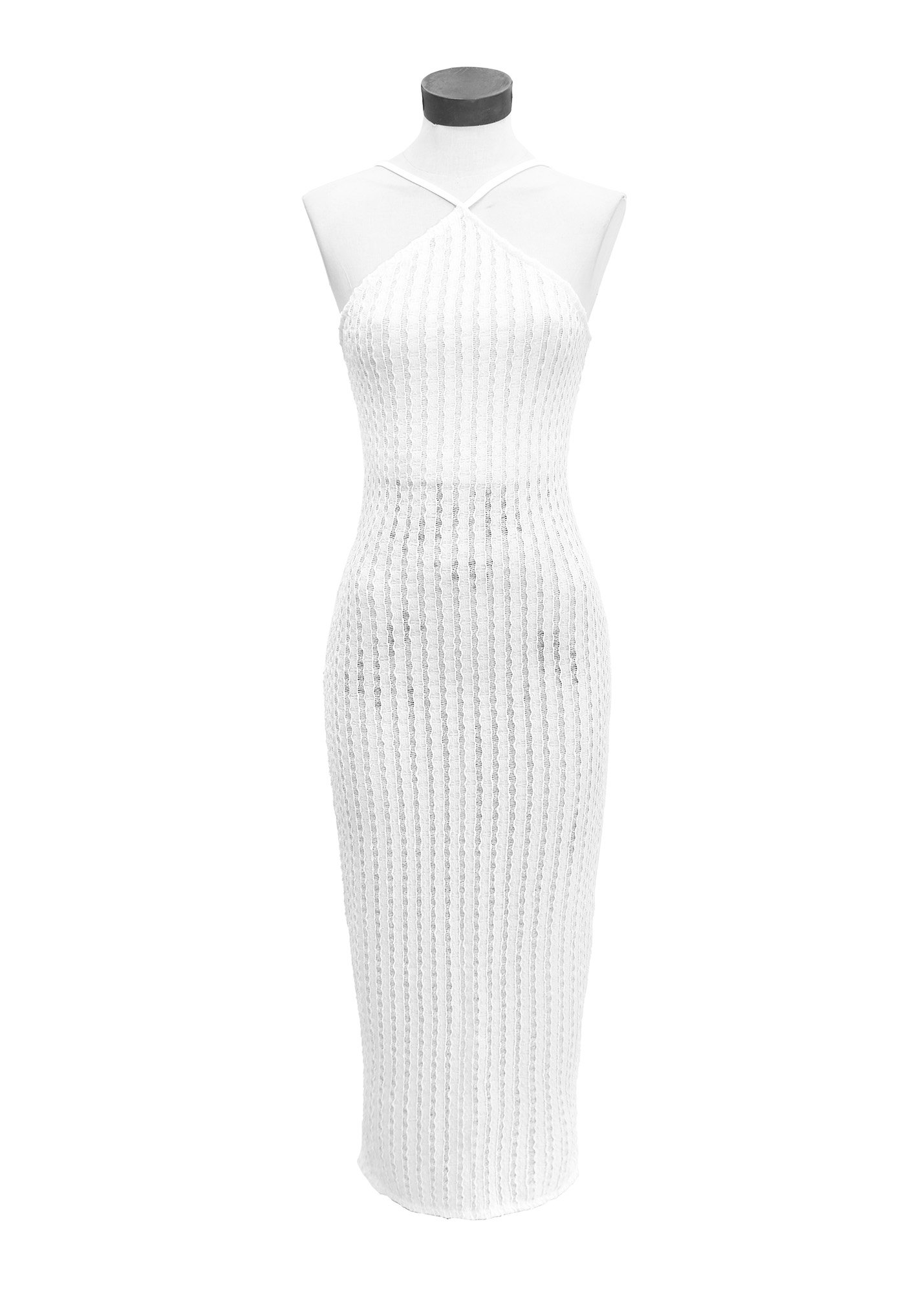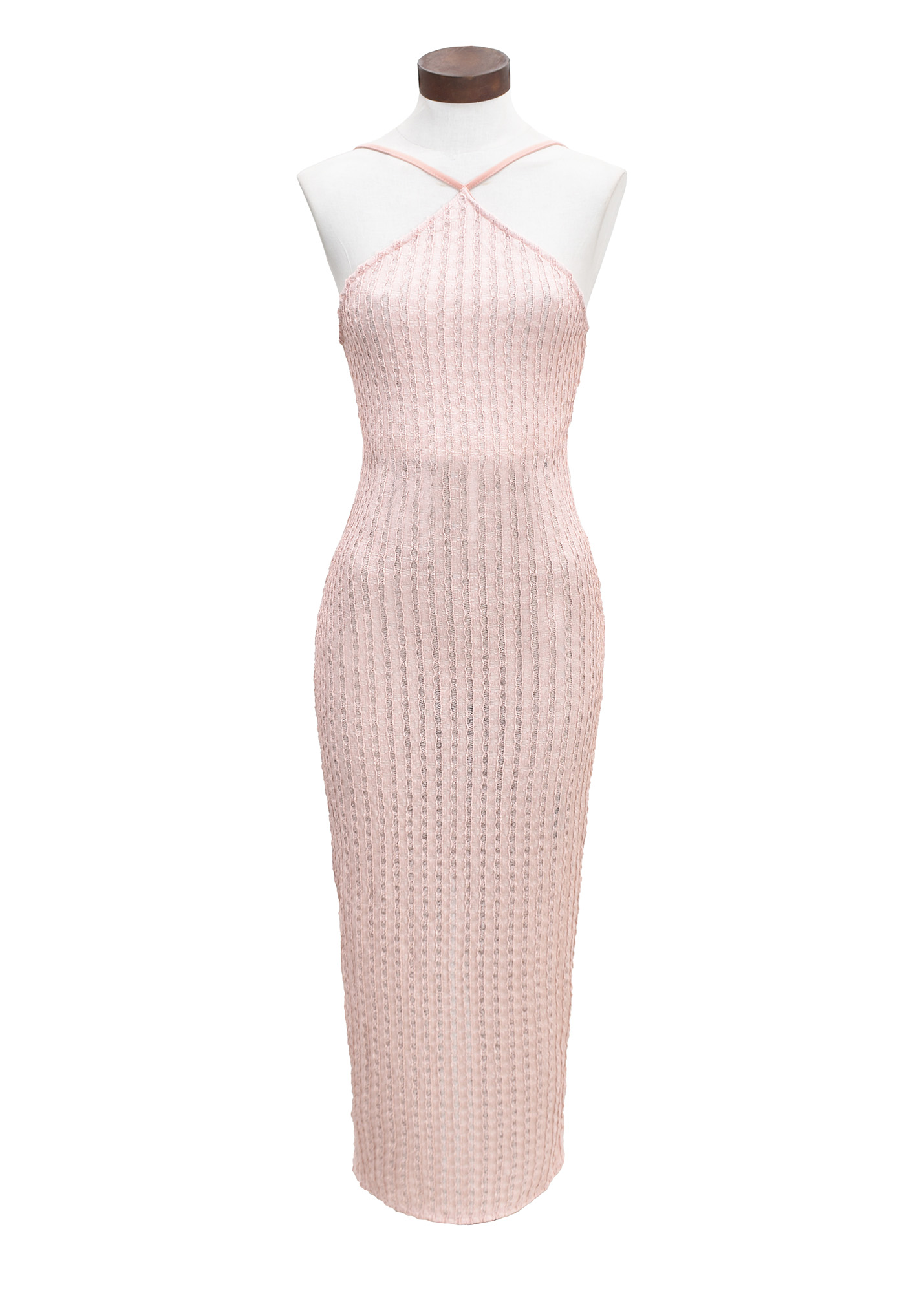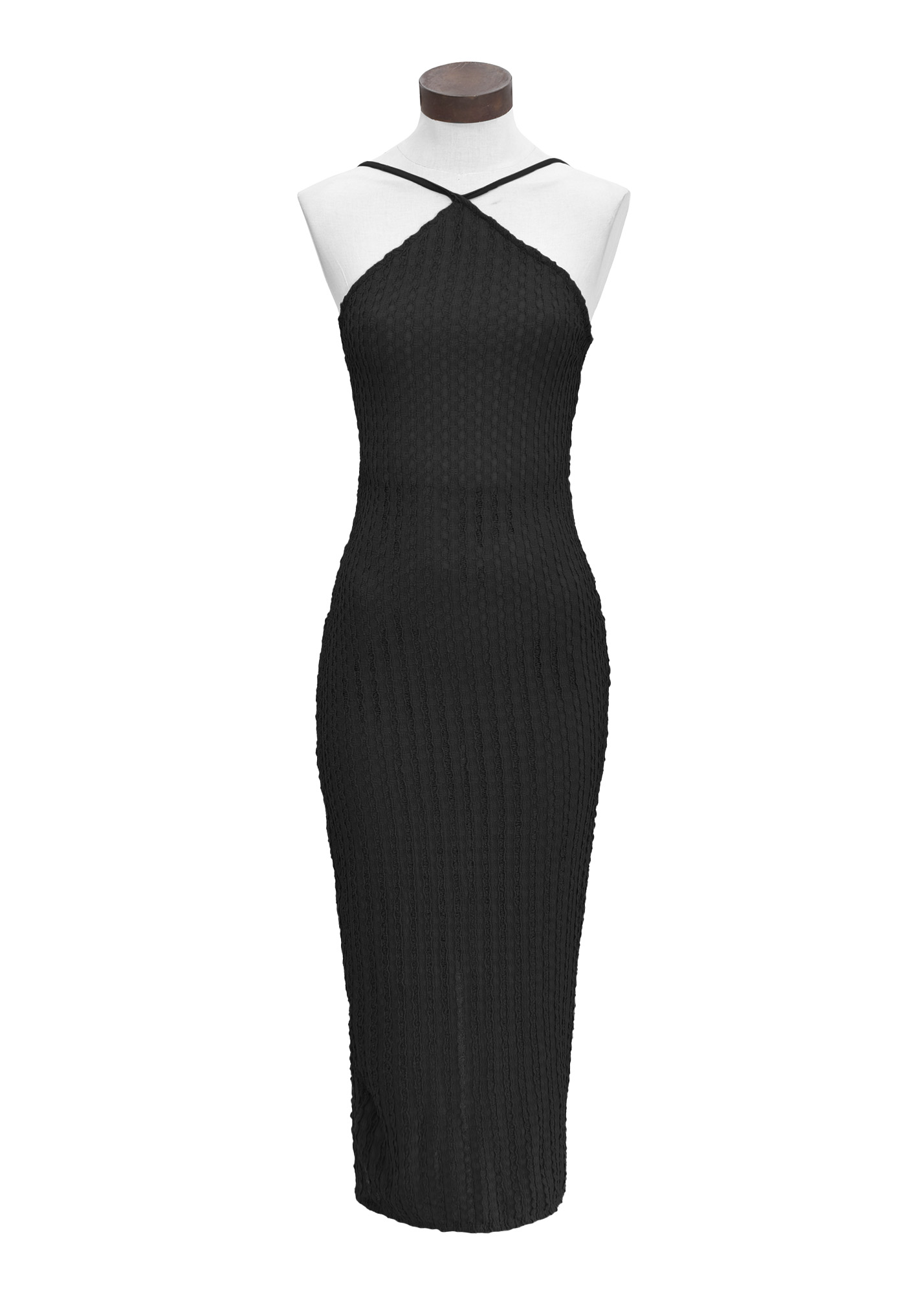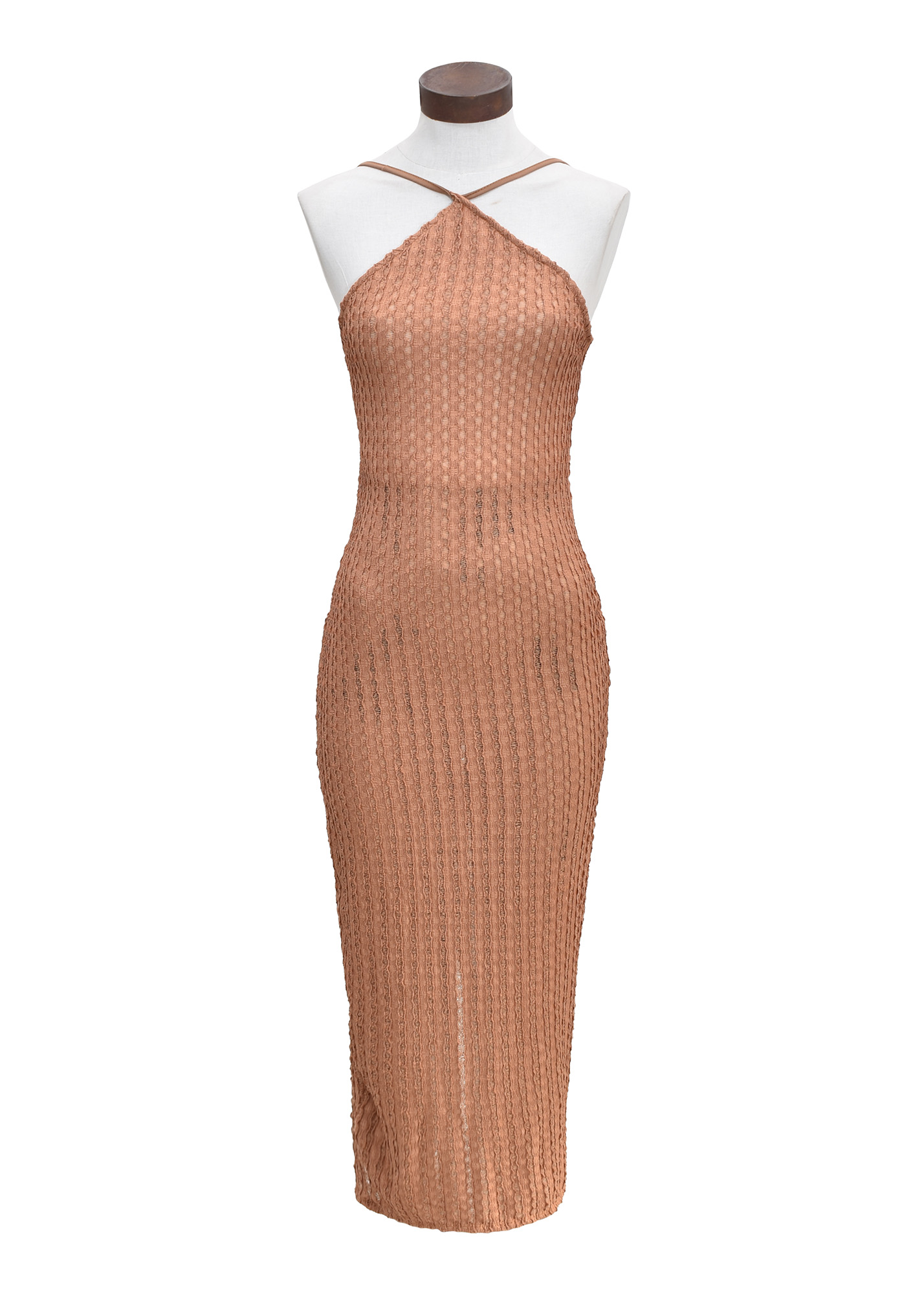 Vestido halter largo de crochet con tiras finas cruzadas con detalle de punto acanalado vertical, tajo en la parte trasera